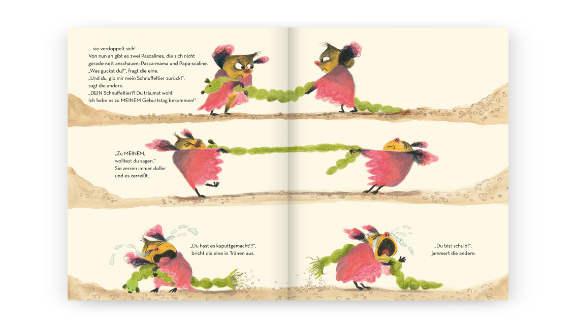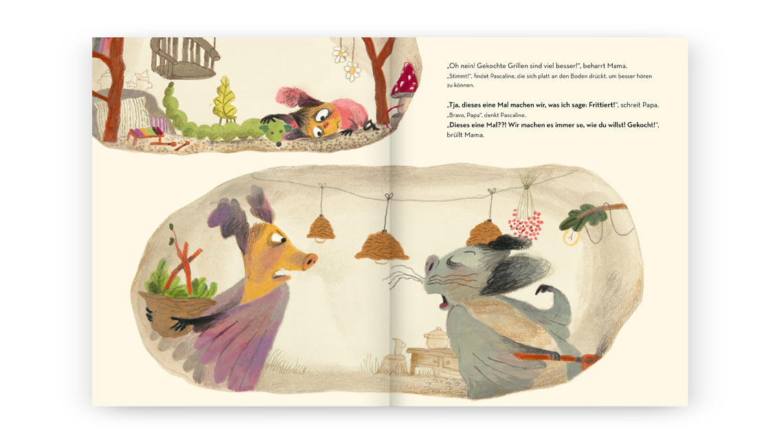Pascaline’s parents are having an argument: should they rather boil or fry crickets for dinner? The little bat loves both her parents so much she wishes she could just agree with the two of them. But that’s impossible… It is as if there were two Pascalines: one rooting for her dad and the other for her mum. This way everyone would be happy, isn’t it?