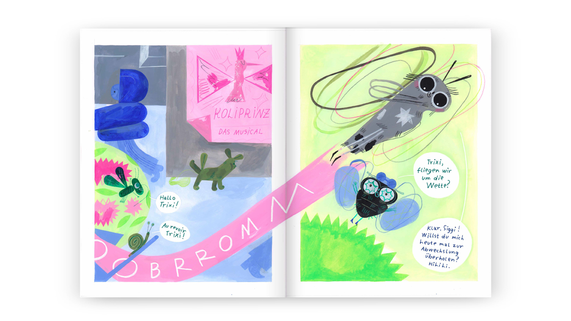 Trixi is a twinkly and (sometimes a bit) fickle moth, or -more precisely- a hummingbird hawk-moth (Macroglossum stellatarum) whom people often take for a true feathered hummingbird. Swift like a spring breeze, she flies and races around with her best friend, Siggi the butterfly, and as they flutter whimsically through the town, they stop here & there to enjoy their favorite nectar out of the lilacs. But always getting mistaken for a hummingbird makes her miserable: as soon as people realize she is no bird but a big moth, they turn away from her in disgust. Why can’t she be so elegant, so focused, so beautiful and so widely beloved as a hummingbird?